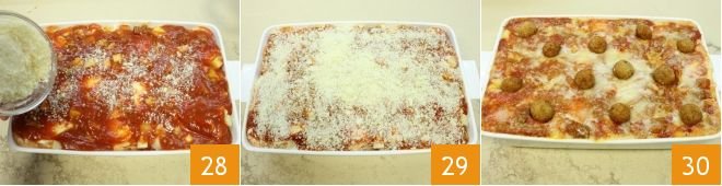 Add the mozzarella, smoked cheese 25, meat ragù, and sprinkle with grated cheese 26. Continue with another layer of lasagna sheets 27.