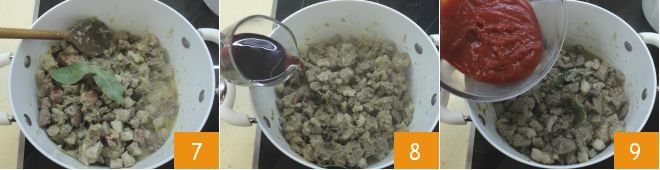 Add the bay leaf 7 and ground cloves. Pour in the red wine 8, let it evaporate, then add the tomato sauce 9, salt, and let everything simmer over low heat for at least two hours. Then turn off the heat and let everything cool.