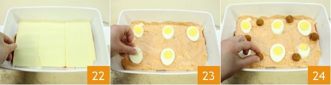 Take a 12x8 inch baking dish and spread a little extra virgin olive oil and some sauce on the bottom. Lay down the first layer of lasagna 22 and cover it with the ricotta cream 23, place the thinly sliced hard-boiled eggs and distribute the fried meatballs 24.