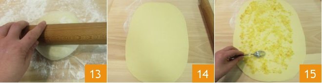 Roll out the dough with a rolling pin 13 to get a thin rectangular sheet measuring about 20 x 14 inches 14. Fill the sheet with the sugar and orange zest mixture, distributing it evenly 15.