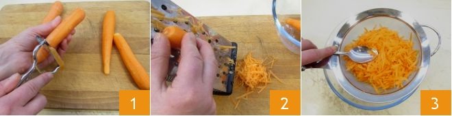 To make the carrot and blueberry muffins, start by peeling the carrots 1, then grate them with a large-holed grater 2 and transfer them to a sieve, pressing them with a spoon from time to time 3 to remove the excess liquid.