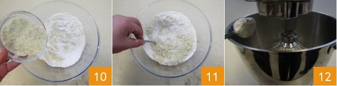 Add the almond flour 10 to the sifted flour and mix everything thoroughly 11. When the eggs have become light and frothy, gradually incorporate the dry ingredients 12, keeping the mixer running until you get a smooth and consistent batter. If using an electric mixer, you can continue to work the mixture with the beaters while gradually adding the flour.