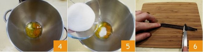 In the meantime, prepare the batter: pour the eggs into the bowl of a stand mixer 4, add the sugar 5, and turn on the machine (alternatively, use an electric mixer). Score a vanilla bean and, using a sharp knife, scrape out the seeds 6.