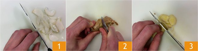 To prepare the carrot, ginger, and toasted squid soup, first finely chop the onion 1. Peel the ginger 2 and cut it into slices 3.