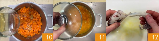 Pour in vegetable broth 10, cover with a lid 11, and let it cook on low heat for 20 minutes or until the carrots are tender. In the meantime, clean the squid. After washing them thoroughly, gently detach the head from the body 12.