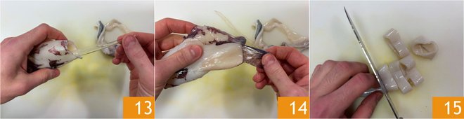 Remove the cartilage pen from the body 13. Finally, remove the outer skin 14 and then thoroughly rinse both the outside and inside of the body. Cut the squid into rings about 0.4 inches thick 15.