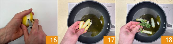 Peel the lemon with a vegetable peeler 16. In a pan, pour the oil, add the crushed unpeeled garlic, lemon peels 17, fresh marjoram 18, and sauté for a few minutes.