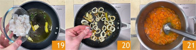 Add the squid 19 and cook over medium-high heat for 3-4 minutes, stirring often. When they are well browned, season with salt and pepper 20. Blend the carrots with an immersion blender 21 until you obtain a smooth and homogeneous mixture. If it is too thick, you can add more vegetable broth or water. If you like, add some lemon juice.
