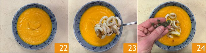 Pour the carrot soup into the dish 22, add the squid 23, and a few marjoram leaves 24.