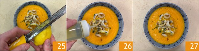 Finish with a sprinkle of grated lemon zest 25 and a drizzle of raw oil 26. The carrot, ginger, and toasted squid soup is ready to be served 27.