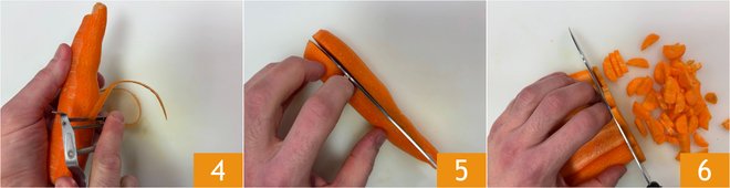 Peel the carrots 4, cut them in half 5, and then slice them 6.