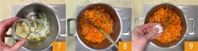 In a pot, pour the oil, add the onion and ginger 7, and sauté over medium heat for a few minutes until the onion becomes slightly translucent. Then add the carrots, stir for 2 minutes 8. Season with salt and pepper 9.
