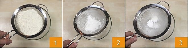 To prepare the carrot and limoncello cake, start by sifting the flour 1, the baking powder 2, and the baking soda 3. Set them aside as you will incorporate them gradually during the batter preparation.