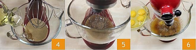 Then pour the brown sugar into the bowl of a stand mixer or a regular bowl if you use an electric mixer and add the sunflower oil 4. Mix until you obtain a fairly uniform mixture 5, then add the shelled eggs one at a time 6.