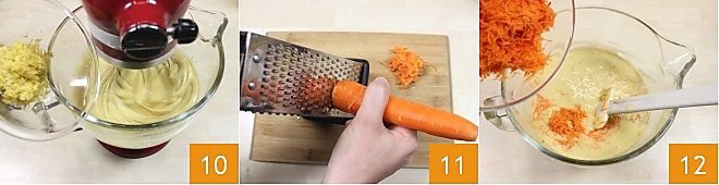 Add the grated lemon zest to the mixture 10, let it blend for a few seconds, then stop working with the stand mixer or electric mixer. Then grate the carrots 11 and add them to the mixture, stirring everything with a spatula 12.