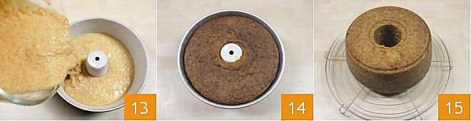 Now butter and flour a bundt pan with a diameter of 9 inches and a height of 3.5 inches. Pour the mixture into the pan 13 and bake in a preheated oven at 350°F for about 70 minutes (if using a convection oven, bake at 320°F for 60 minutes). Bake until the surface is golden brown 14, in any case, before removing it from the oven, do the toothpick test. If the cake darkens too much on the surface during baking, cover it with a sheet of aluminum foil and continue baking. When it's ready, remove it from the oven and gently unmold it. You can help yourself with a knife, which you will pass along the edges of the pan. Let it cool on a rack 15.
