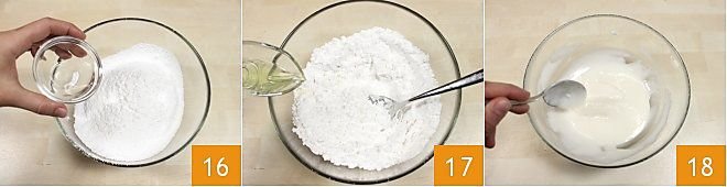 In the meantime, prepare the glaze: heat water and limoncello in the microwave for about a minute at maximum power or in a saucepan. In a bowl, pour the sifted powdered sugar, add the warm water and limoncello (16-17), and mix well with a spoon to dissolve the lumps 18.