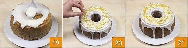 Once the cake has cooled, keep it on the rack and pour the glaze over it using a spoon 19. Then decorate the surface with candied lemon peels 20 and your carrot and limoncello cake is ready to be served and enjoyed 21!