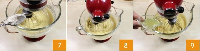 Take the flour, baking powder, and baking soda you sifted at the beginning and add them slowly to the mixture 7, also adding 2 pinches of salt. When the mixture is well combined 8, pour in the limoncello 9.