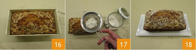The batter is ready 13, pour it into a tapered loaf cake mold that measures 6.7x3.15 inches at the base and 4.3x7.9 inches at the top, with a 2.75-inch high edge 14. Decorate the surface with almond slivers 15.