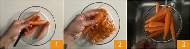To prepare air fryer carrots, preferably use small and tender carrots. Start by removing the ends 1, then peel them with a vegetable peeler or a sharp knife 2. After peeling, wash them thoroughly 3.