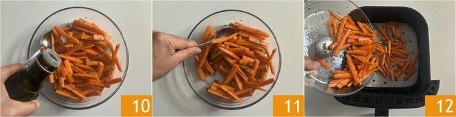 Next, season with a drizzle of extra virgin olive oil 10. Mix everything well 11. Transfer the carrots to the air fryer basket; you can use perforated parchment paper or place them directly in the basket 12.