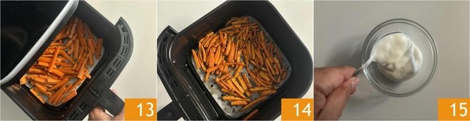 At this point, cook the carrots for about 12 minutes at 392°F, making sure to check them during cooking and stir if necessary 13. The carrots should be golden 14. To prepare the yogurt sauce to accompany the carrots, pour two tablespoons of plain or Greek yogurt into a bowl 15.