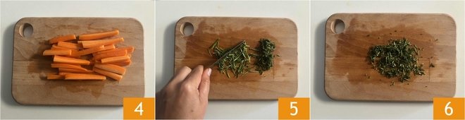 Cut the carrots lengthwise into sticks about 1.5 inches long 4, then wash the herbs, remove the woody central part of the rosemary 5, and chop only the needles along with the sage leaves 6.