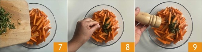 Now transfer the carrots to a large bowl and add the previously chopped herbs 7. Then adjust the salt 8 and pepper 9.