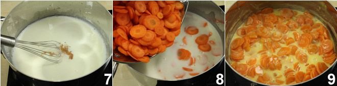 nutmeg and salt 7: mix well with a whisk to avoid forming lumps and as soon as the liquid in the pan starts to boil, add the sliced carrots 8. Let the carrots with milk cook gently until they are tender but not mushy, and the cooking liquid has thickened and reduced significantly 9. Before finishing cooking, adjust the salt if necessary and then serve the carrots with milk hot and creamy. If you like, you can sprinkle them with chopped parsley, or (if not serving to children) dust them with white pepper.