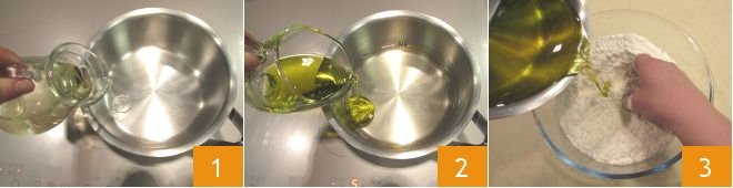 To prepare the Apulian cartellate, start by making the dough: put the white wine 1 and oil 2 in a saucepan and heat slightly, up to a temperature of about 95°F. Place the sifted flour in a bowl and pour the oil and wine emulsion into the center 3.