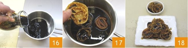 Now take care of the traditional cartellate topping: place the vin cotto in a saucepan and heat it slightly 16. Immerse the cartellate, a few at a time, to soak them on both sides 17, then place them on a serving plate and serve your cartellate immediately 18.