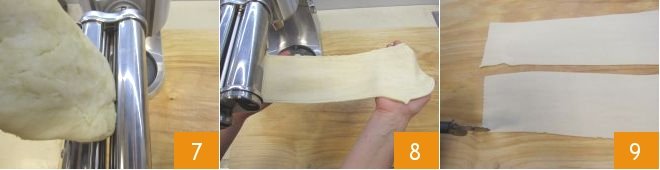 before rolling it out with a pasta roller starting from the thickest setting 7 until reaching a thickness of about 1/16 inch 8 (if you don't have a pasta roller, you can easily roll out your dough with a rolling pin). From the dough sheet, use a fluted pastry cutter to cut rectangles 9