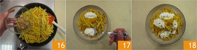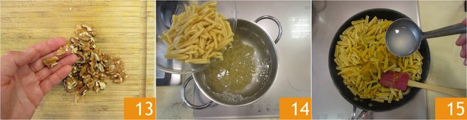 Coarsely chop the walnut kernels 13. Meanwhile, boil the casarecce in salted boiling water 14, draining them directly into the pan with the pumpkin a couple of minutes before the pasta finishes cooking. Add a little cooking water 15, without turning the heat back on.