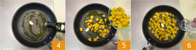 Pour a drizzle of oil into a pan and add the garlic clove 4. Let it sauté for a couple of minutes, then add the pumpkin 5. Cook over high heat for 5 minutes, stirring occasionally, then add 1/2 cup of water 6.