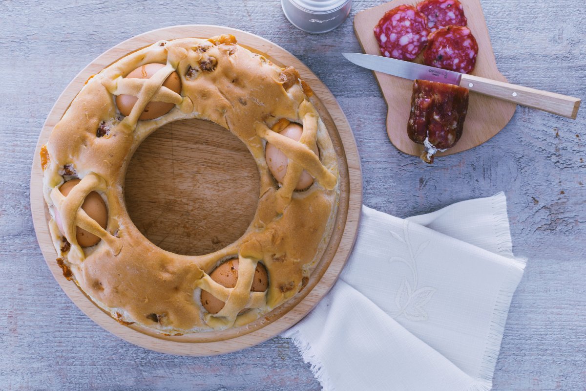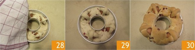 Once finished, cover the casatiello with a clean cloth 28 and let it rise at room temperature away from drafts for about 1 hour to 1.5 hours. Once the volume has almost doubled 29, bake your Neapolitan casatiello in a preheated static oven at 340°F for 75 minutes, placing the pan at the bottom of the oven. Once cooked, let it cool slightly, then gently remove it from the mold and place it on a serving plate. Your torn casatiello is ready to be shared with the whole family 30!