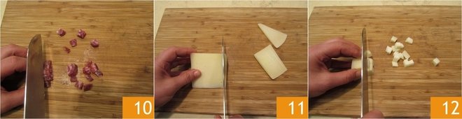 Remove the skin from the salami and cut it into cubes 10. Use a knife to remove the rind from the pecorino 11 and cut it into cubes of the same size as the salami 12.