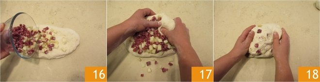 Place the cubes of pecorino and salami in the center 16, and work it with your hands until all the ingredients are evenly incorporated 17 18.