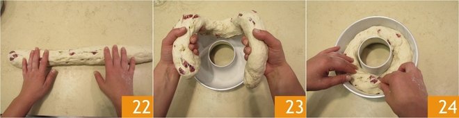 When it is long enough 22, place the loaf into a pre-buttered 9.5-inch diameter bundt pan 23, joining and sealing the two ends 24.