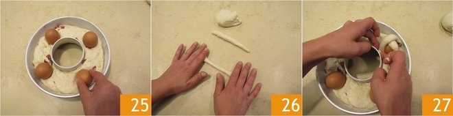 Now place the raw eggs vertically in 4 well-spaced points of the casatiello, pressing them lightly 25. Take the reserved dough and work 8 pieces to form small cords 26. Place the cords over the eggs to cage them and create a cross 27.