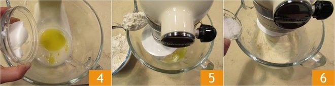 Also, add the other fats: oil and lard 4. Start mixing the ingredients at low speed and gradually incorporate half of the flour using a spoon 5. Once the flour is absorbed and you have a sort of batter, add the salt 6.