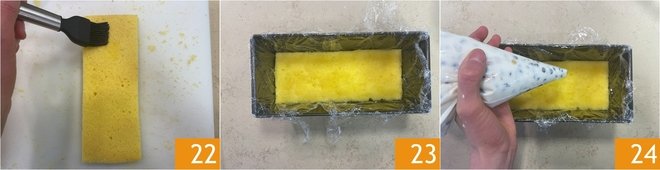 Line the loaf pan with plastic wrap, then brush a rectangular base of sponge cake with the syrup 22. Place the first layer on the bottom 23, transfer the cream into a piping bag without a nozzle and fill with half of the cream 24.