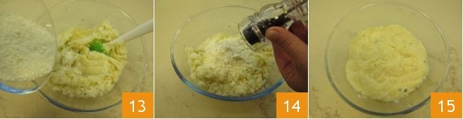 Then add the grated Grana Padano 13, salt, and pepper 14, and mix to uniform the mixture 15.