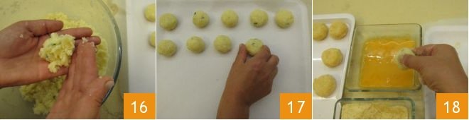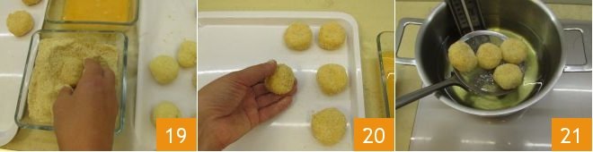 and then in the breadcrumbs 19, placing them on another tray 20. Heat the peanut oil in a deep pan until it reaches a temperature of 340°F (measured with a kitchen thermometer) and start frying a few meatballs at a time 21,