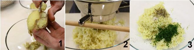 To prepare the Palermo cazzilli, start by washing and boiling the potatoes (preferably whole with the skin) in salted water, then drain them and let them cool completely (you can also cook them the night before). Peel the potatoes 1 and pass them through a food mill 2 taking care to obtain a fine, lump-free purée. Add salt, pepper, and chopped parsley (or mint) to the purée 3,