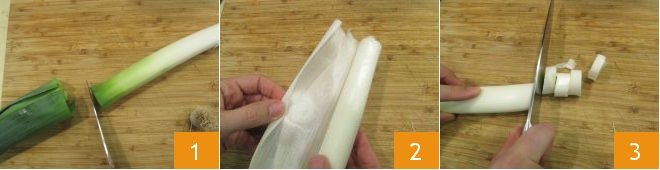To prepare the celeriac velouté, first, clean the vegetables: rinse the leeks under running water, remove the green part 1 and the root part found at the opposite end, then make a longitudinal incision with the knife and remove the tougher outer leaves 2; finally, cut the leek stem into chunks about an inch thick 3. You should obtain approximately 10 oz of cleaned leek.