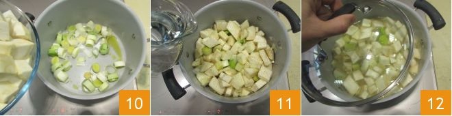 and the celeriac 10, increase the heat and toast them for another 5 minutes, then pour in cold water 11, cover with a lid 12 and let it cook over medium heat for about 40 minutes.
