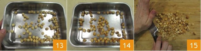 Meanwhile, arrange the peeled hazelnuts on a baking sheet 13 and toast them in a preheated fan oven at 375°F for about 15 minutes or until golden brown 14; once toasted, coarsely crush the hazelnuts by pressing them with the flat side of a knife blade 15.