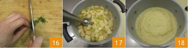 Finally, finely chop the sage leaves you set aside 16. After the cooking time for the vegetables, turn off the heat and blend everything with an immersion blender 17 until you get a creamy mixture 18.