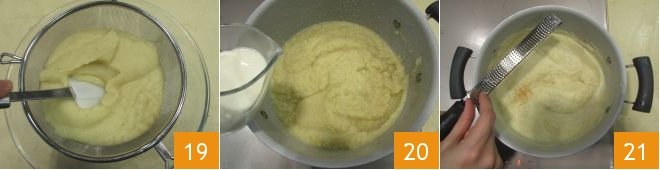 Pour the cream into a sieve and strain it with a spatula to obtain a velvety texture 19. Add the fresh cream 20 and grated nutmeg 21 and mix well.